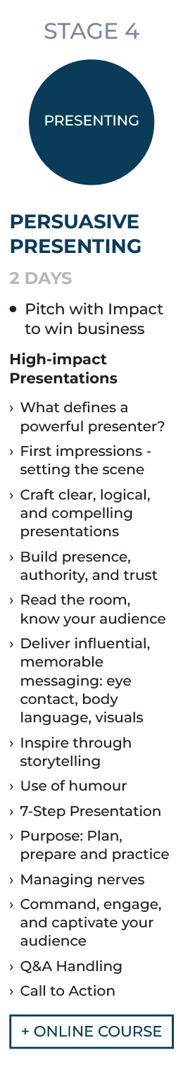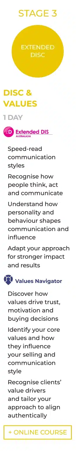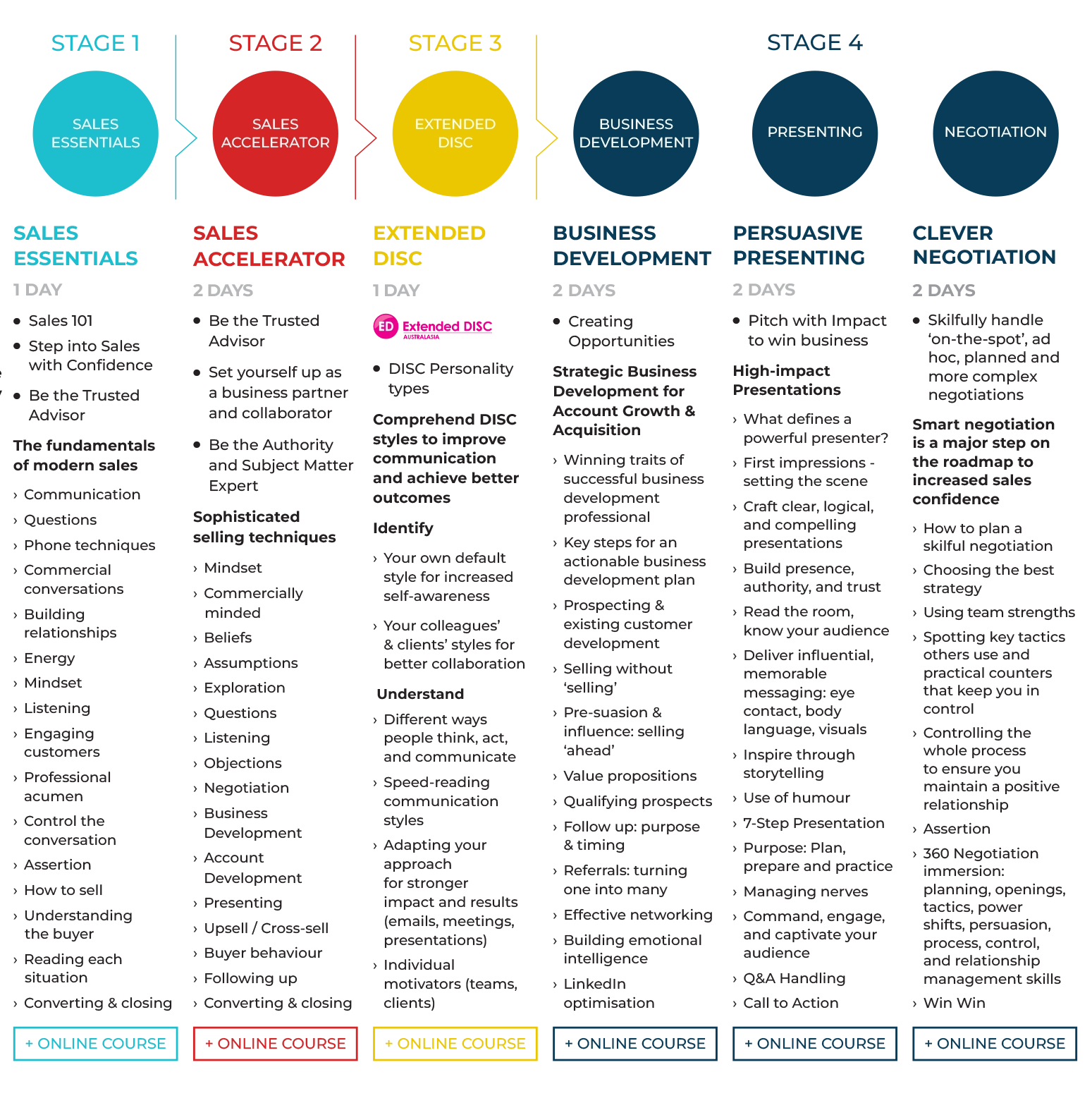 Whether you’re building core skills or refining advanced techniques, our professional sales training pathway typically includes these core programs: