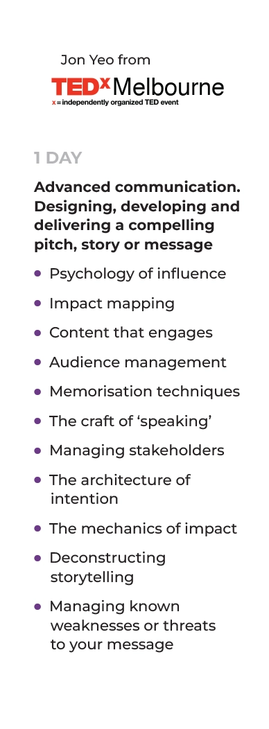 ♦ Advanced communication. Designing, developing and delivering a compelling pitch, story or message