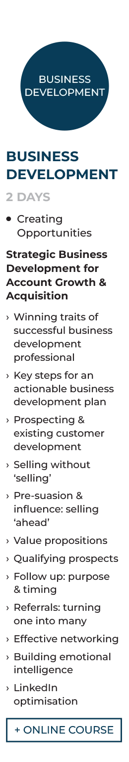 - Specialist Deep Dives – Business Development, Presentation Skills, Negotiation